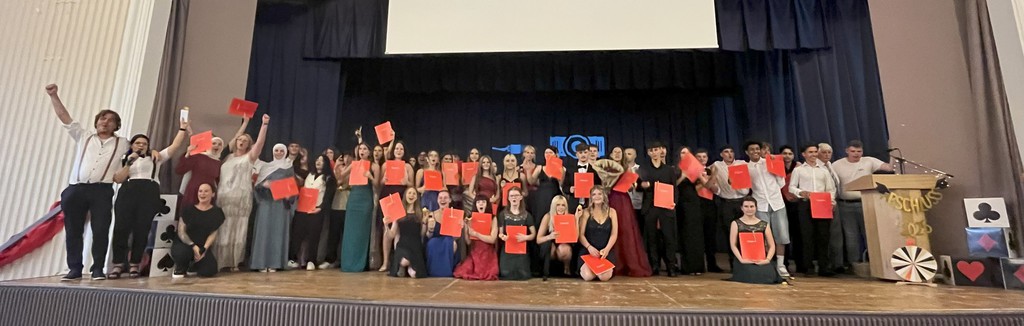 Am Montag, den 30.06.25, war es soweit: Unter dem Motto „Casino Night“ fand die Abschlussfeier des Jahrgangs 10 im Schlosstheater Ottweiler statt. 52 Schülerinnen und Schüler erlangten in diesem Jahr den Mittleren Bildungsabschluss. Von ihnen bewältigten 20 die Prüfung, wodurch sie ihren MBA mit Stolz in Empfang nehmen konnten. Die übrigen 32 Schülerinnen und Schüler erhielten den Mittleren Bildungsabschluss ohne Prüfung und sind zudem alle berechtigt, in die gymnasiale Oberstufe zu wechseln. Nicht weniger als 24 von ihnen haben sich dazu entschieden, ihren Weg in der gemeinsamen Oberstufe der Gemeinschaftsschulen Schiffweiler, Bexbach und Neunkirchen fortzusetzen.
