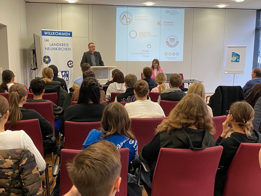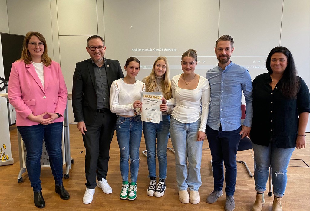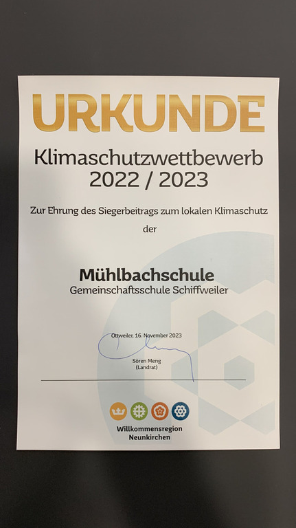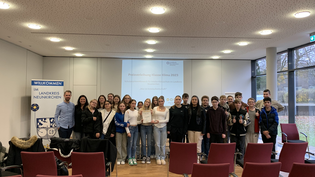 Bei der Abschlussveranstaltung des Wettbewerbs am 16.11.23 in Neunkirchen wurden dann die Sieger bekannt gegeben. In der Altersstufe 7. bis 9. Klasse zeichnete die Jury, bestehend aus Landrat Sören Meng, Kreistagsmitgliedern sowie Mitgliedern der Bau- und Schulverwaltung, die Klasse 8b mit einer Siegerprämie von 1.000 Euro aus, die nun für die Verbesserung und Verstetigung des Klimaschutzes in der Mühlbachschule eingesetzt werden. „Diese Auszeichnung ist nicht nur ein verdienter Erfolg für die Klasse 8b, sondern auch eine inspirierende Anerkennung für alle, die an der Umsetzung dieses Projekts beteiligt waren. Die Preisverleihung durch den Landrat markiert einen bedeutenden Meilenstein in der schulischen Umweltbildung und unterstreicht die Wichtigkeit von Initiativen, die dazu beitragen, Umweltbewusstsein und Nachhaltigkeit in den Fokus der schulischen Aktivitäten zu rücken“, so Christian Meyer, der das Projekt als Lehrer der Klasse betreute.