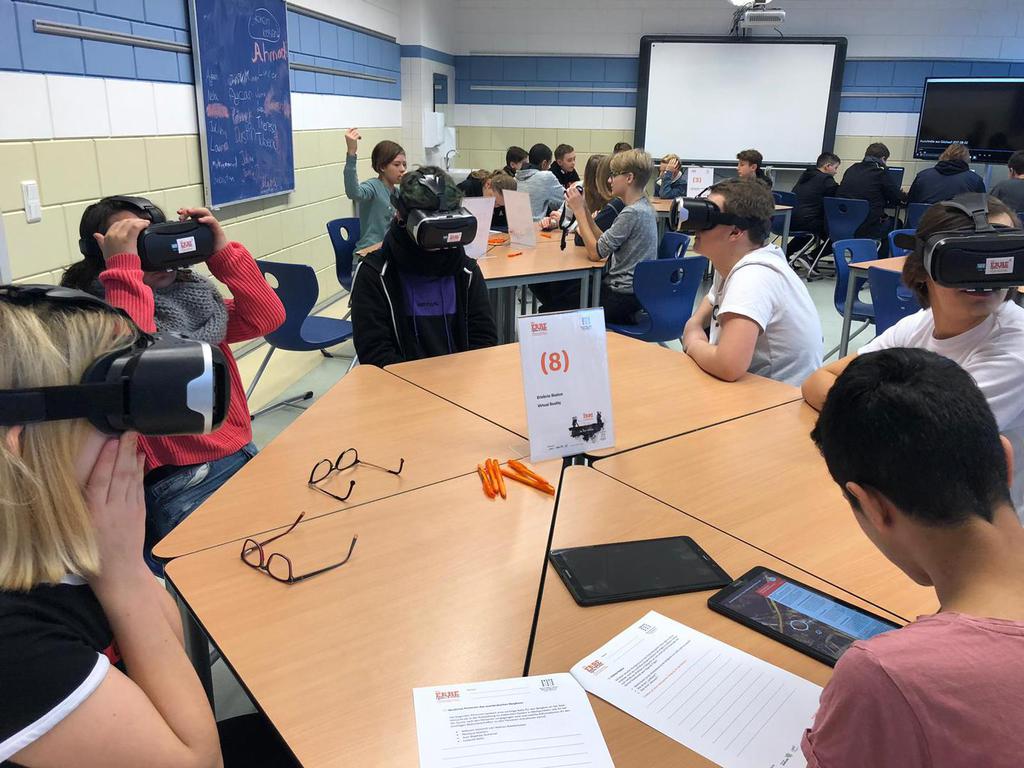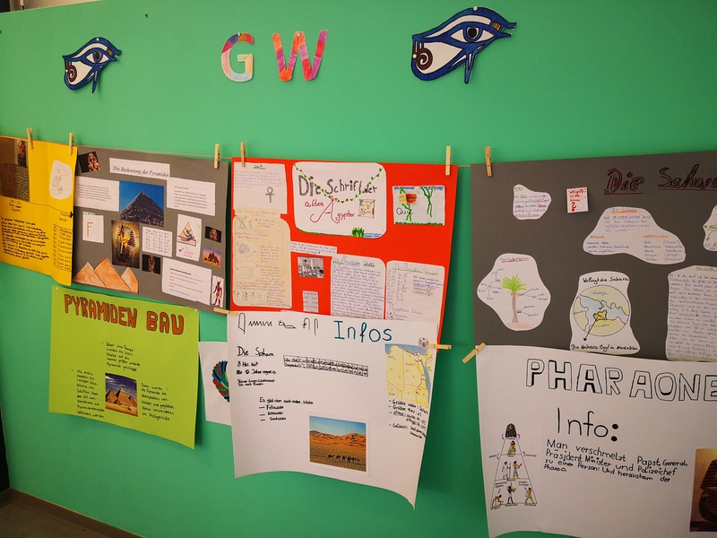 Die Klasse 5c von Frau Wagner-Bolla arbeitete sehr motiviert mit der Lern-App Anton in den Fächern Deutsch und Mathematik. Durch zwei mobile Tablet-Koffer wird an der Mühlbachschule in verschiedenen Unterrichtssituationen medial gearbeitet, da jeder Klassenraum mit einem Internetzugang ausgestattet ist. Der Jahrgangsflur 6 wurde in eine ägyptische Ausstellung verwandelt. Schüler der Klasse 6a präsentierten hier ihre Unterrichtsergebnisse des Faches Gesellschaftswissenschaften.