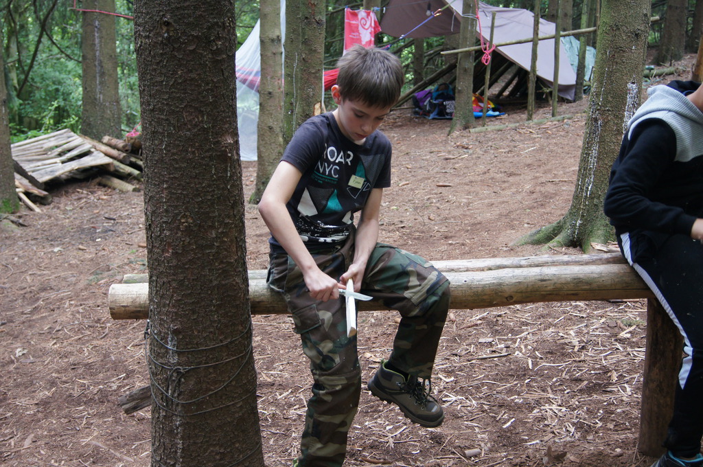 Nach 11 km erreichte die Klasse das Camp und war voller Spannung und Neugierde ihr „Zuhause“ für die nächsten drei Tage kennenzulernen. Natürlich ohne Strom, fließendes Wasser und festem Dach über dem Kopf. Auch moderne Entertainmentprodukte fehlten natürlich. Dafür erlebten wir die Natur pur. Schlafen auf dem Waldboden, nur mit Isomatte und Schlafsack mit unverbautem Blick durch die Fichten in die Sterne. Wer es ein wenig komfortabler wollte, zog in die „Waldvilla“ oder in das Baumhaus ein. Nachdem jeder einen Schlafplatz gefunden hatte und das Camp mit Waschplatz, Feuerstelle, Kochstelle und Toiletten besichtigt hatte, begann das „Survival“-Programm. Überleben im Wald bedeutet, dass man zumindest einen Schlafplatz, Feuer und Wasser braucht. So lernten die Schüler/innen der 7c wie man einen geeigneten Platz für eine Laubhütte findet und wie man eine solche dann auch baut. Kaum zwei Stunden später standen zwei Laubhütten im Wald, die mit vereinten Kräften gebaut wurden. Feuer wurde nicht einfach mit Streichholz und Anzünder gemacht, sondern mit allen möglichen Hilfsmitteln aus der Natur. Wir lernten, dass das Innere von Rohrkolben, die Wurzel der Kiefer oder Baumharz der Fichte super Anzünder sind. Verkohlte Baumwolle kann mit dem Funkenschlag eines Feuersteins mit einem Feuerstahl entzündet werden, wenn sie anschließend in ein Stück Birkenrinde gebracht wird und man ordentlich pustet, ist die Chance ein Feuer zu haben, sehr groß. Besteck schnitzen wir aus Lindenholz und Körbe wurden aus Pettigrohr geflochten. Eine nahegelegene Wasserstelle im Tal wurde aufgesucht, um zu lernen wie man gefundenes Wasser trinkbar macht. Am zweiten Abend besuchte uns der Wildkräuterexperte Michael Madenach. Er erklärte, welchen Wald- und Wiesensalat man sehr schmackhaft zubereiten und essen kann. Von verschiedenen Baumblättern über Zutaten von der Wiese war vieles Bekanntes (z.B. Löwenzahn), aber auch vieles Neues wie Wegericharten, Knöterich, Ampfer und Wiesenkerbel dabei. Auch die heilende Wirkung der Kamille, Brennnessel und des Spitzwegerichs wurde angesprochen.