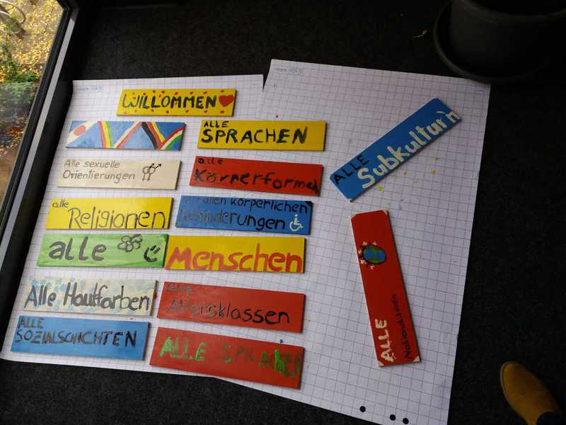 Im letzten Workshop sammelten die Teilnehmerinnen bekannte Vorurteile und untersuchten hier den sprachlichen Aufbau. In einem Spiel sollten sich die Schülerinnen mit 10 Schlagworten selbst beschreiben und diese dann bis auf ein einziges streichen und dies sichtbar für die anderen auf die Stirn kleben. Die Absicht war zu erkennen, was macht das mit jemandem, wenn er auf ein Merkmal reduziert wird. Wichtig war hier zu erkennen, dass man Menschen nicht auf ein Merkmal reduzieren kann und darf. Als Abschluss gestalteten die Mädchen und Jungen Willkommensschilder auf Holz, die ihren Platz im Eingangsbereich des Neunkircher Jugendamt finden werden.