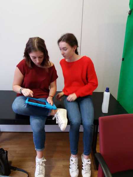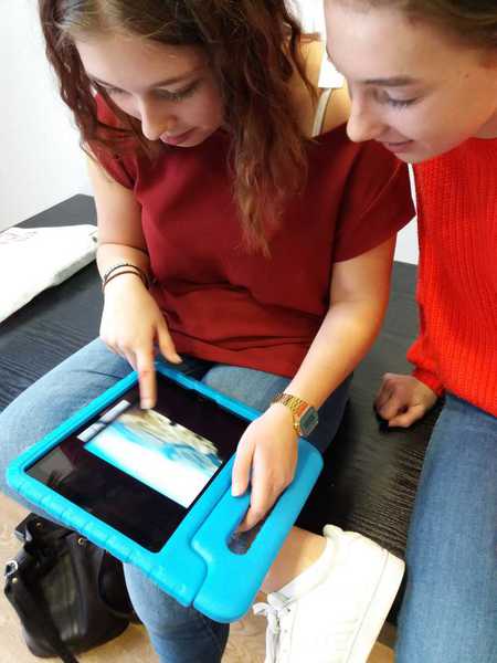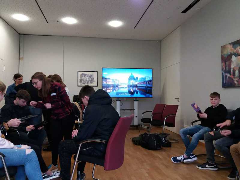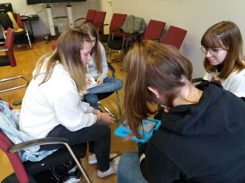 In dem Workshop über Medienmanipulation informierten die beiden Referentinnen mit Hilfe von Bildbeispielen über die Möglichkeit Bilder zu manipulieren. Schon im Ersten Weltkrieg wurden durch Überblendungen Bilder manipuliert oder durch geschickte Bildausschnitte Fotos manipuliert. Heute retuschieren Fotografen oder Influencer Fotos, um bei dem Betrachter bestimmte Gefühle zu erreichen. In der anschließenden praktischen Arbeitsphase sollten die Workshopteilnehmer eigene Fotos erstellen. Mit Hilfe des greenscreens, einem grünen Tuchs konnten sich die Jungen und Mädchen in bestehende Fotos rein schneiden und so bekannte Persönlichkeiten, wie Angela Merkel, Donald Trump oder Wladimir Putin, treffen, an einer Demonstration teilnehmen, den Bundestag besuchen oder in einem Aquarium schwimmen. Besonders witzig waren gefakte Urlaubsfotos. Mit einer einfachen weißen Henkelflasche kann man Urlaubsfotos aus dem Flugzeug erstellen, indem Landschaftsaufnahmen durch den Henkel fotografiert – eine fast lebensechte Aufnahme eines Landeanflugs auf die Trauminsel, ohne jemals dort gewesen zu sein.