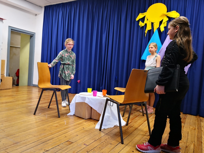 „Alte Märchen, modern erzählt“ war das Tagesmotto der 5a, die zu zwei Aufführungen in die Aula eingeladen haben und vor begeistertem Publikum Schneewittchen und Frau Holle darboten.